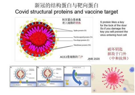 杨教授首先引领大家熟悉了新冠病毒的大致结构。冠状病毒可以呈现各种形状,但它中间包的是RNA核酸,外面围绕着脂肪膜,膜表面有突出的蛋白质。其中,有一种被称作刺突蛋白(S, Spike Protein),是病毒进入人体细胞的钥匙。科学家们就是把这个刺突蛋白作为靶子,研究的疫苗就是针对这个刺突蛋白。