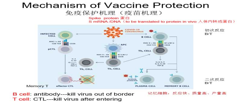- 作为天生的保护机制,人体内具有识别、排斥、破坏和歼灭进入体内异物的能力。科学家们根据这个机制,设计了现在被广泛使用的新冠疫苗。这些疫苗会在细胞内制造出属于新冠病毒但不属于我们自身先天具有的刺突上的蛋白质或蛋白质片段,当这种蛋白质被我们的免疫系统识别后,体内就会启动免疫反应,记住了这种蛋白质,并制造抗体。当冠状病毒再次进入机体,体内的免疫反应就会通过破坏病毒的钥匙,杀死病毒,进而起到保护我们免受冠状病毒感染或因感染而致病的效果。杨博士还解释了什么是特异识别、什么是长期记忆、疫苗需要分两次注射的原因等等。尤其是解释了疫苗保护人体免受病毒侵害的原理,通过诱导B细胞产生抗体,从而起到拒敌(病毒)于边境之外的效果;当然,体内还有其它机制,比如T细胞可以直接歼敌(病毒)于国土之内。