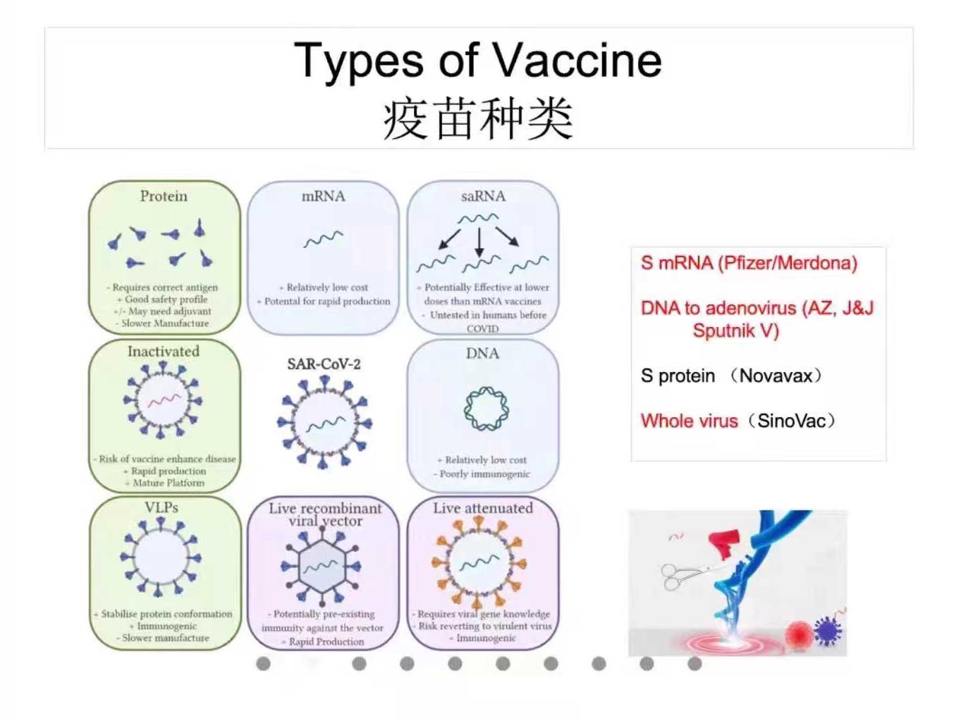 - 疫苗的种类:根据技术路线,现在的新冠疫苗主要分为S mRNA (Pfizer/ Merdona),DNA to adenovirus (AZ, J&J Sputnik V),S protein(Novavax),and Whole virus(Sino Vac)。杨博士就不同疫苗的作用机理和优缺点等方面做了专业性的评价。