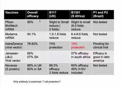 - 各种疫苗的比较:大家都知道,现在已经开始在全球接种的疫苗,是由不同的制药公司生产的。那么,不同的疫苗究竟有哪些不同呢?杨博士通过比较不同厂家的疫苗,针对最初的新冠病毒,以及现在确认的变异毒株,列出了这些疫苗的有效性,通过下表大家可以一目了然。