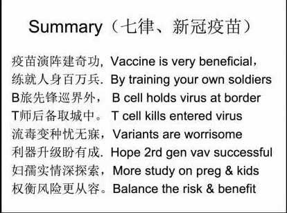 从讲座以后健康群里发来的反馈意见可以看出,杨教授的讲座深受欢迎。它有以下几个方面的特点:首次一人担纲中、英文双语讲座;首次将讲座的摘要写成中国诗词《七律》的格式,并配上英文翻译;能把复杂的医学概念以通俗易懂的方式传授给大家;