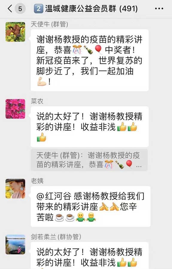 讲座以后,杨教授就大家在讲座中和随后在微信群里提出的一些问题均一一作答。这些问题诸如:“新冠疫苗在研发过程中是否对亚裔人种做过试验?” “中国研制的疫苗效果如何?” “孕妇可否打防疫针?” “曾经感染过新冠病毒的人经过治疗以后仍然有轻微的症状,会继续传染给其他人吗?” 等等。